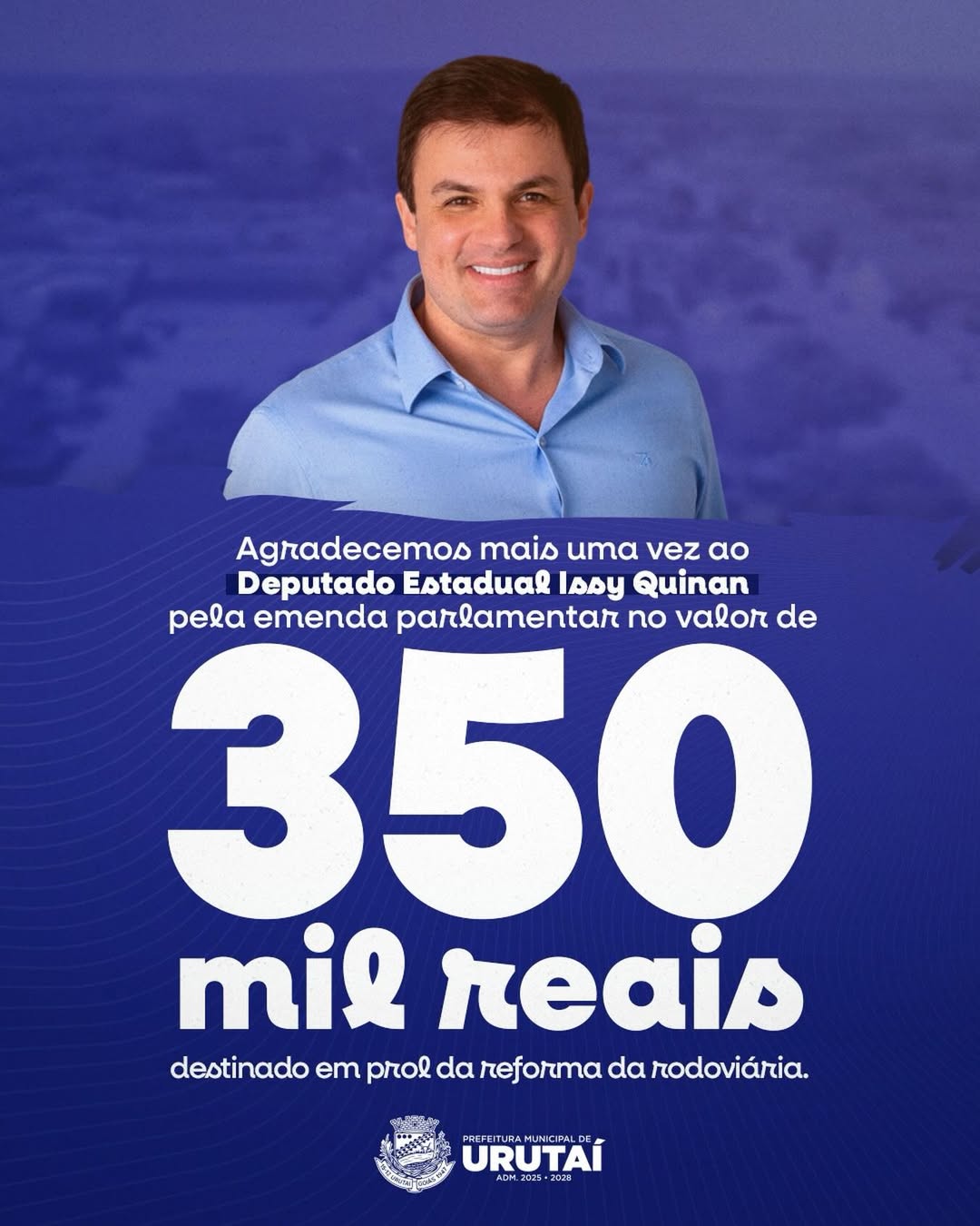 A Administração Municipal agradece ao deputado Issy Quinan pela parceria e pelo compromisso com a nossa cidade. Trabalhar ao lado de quem acredita em Urutaí e investe no desenvolvimento do nosso povo é essencial para continuarmos avançando! ![]()