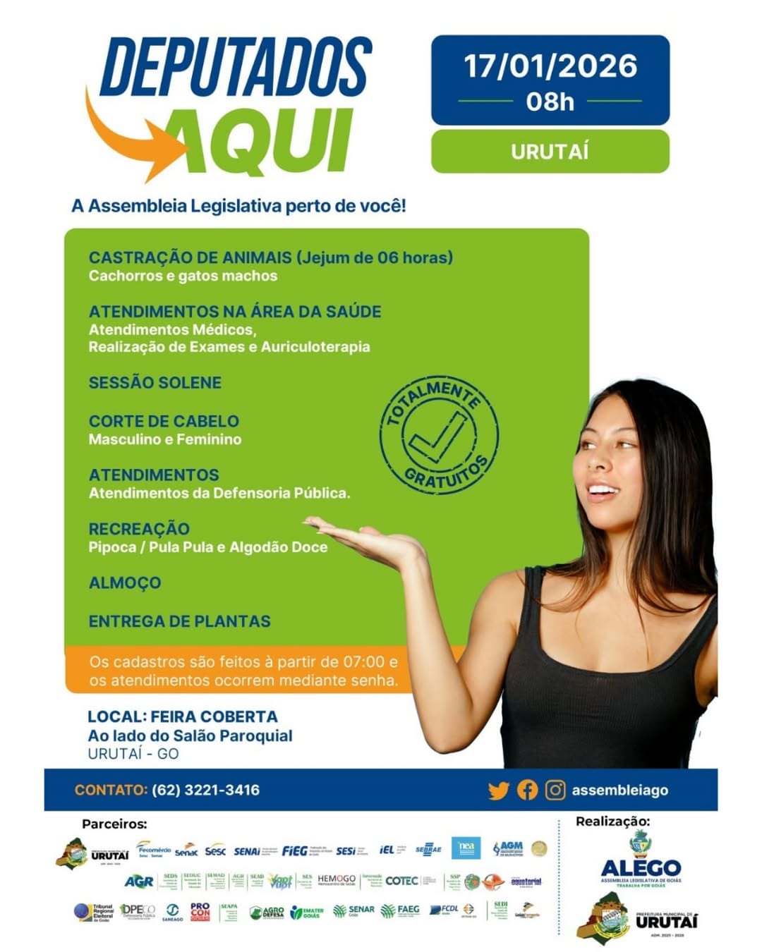 Neste próximo sábado, dia 17, Urutaí recebe o Programa Deputados Aqui, da Assembleia Legislativa de Goiás, que traz serviços essenciais, atendimentos gratuitos e ações para toda a família. ![]()