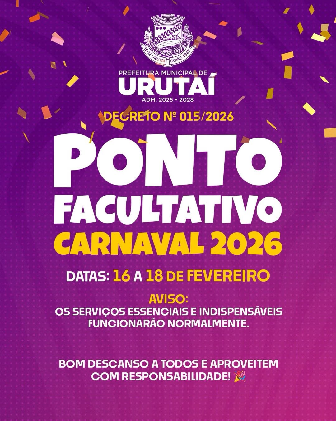 A Prefeitura de Urutaí informa que, conforme o Decreto nº 015/2026, fica estabelecido ponto facultativo nas repartições públicas municipais nos dias 16, 17 e 18 de fevereiro, em razão do período de Carnaval. ![]()