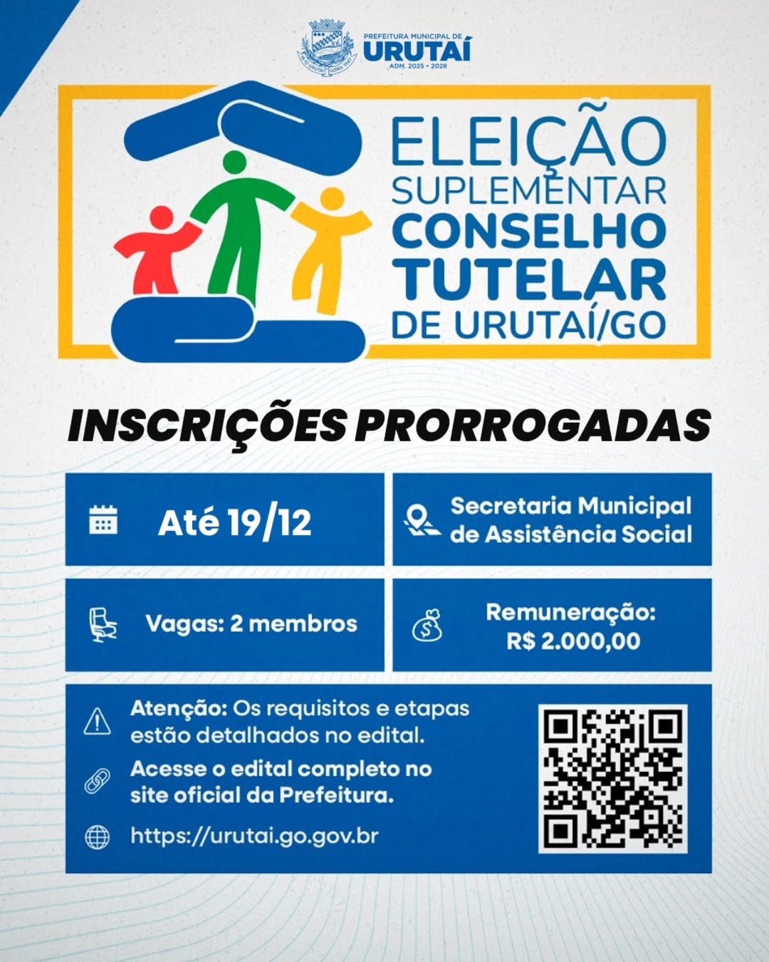 O Conselho Municipal da Criança e Adolescente (CMDCA) de Urutaí informa que foram prorrogadas as inscrições para o processo de escolha suplementar dos novos Conselheiros Tutelares de Urutaí.