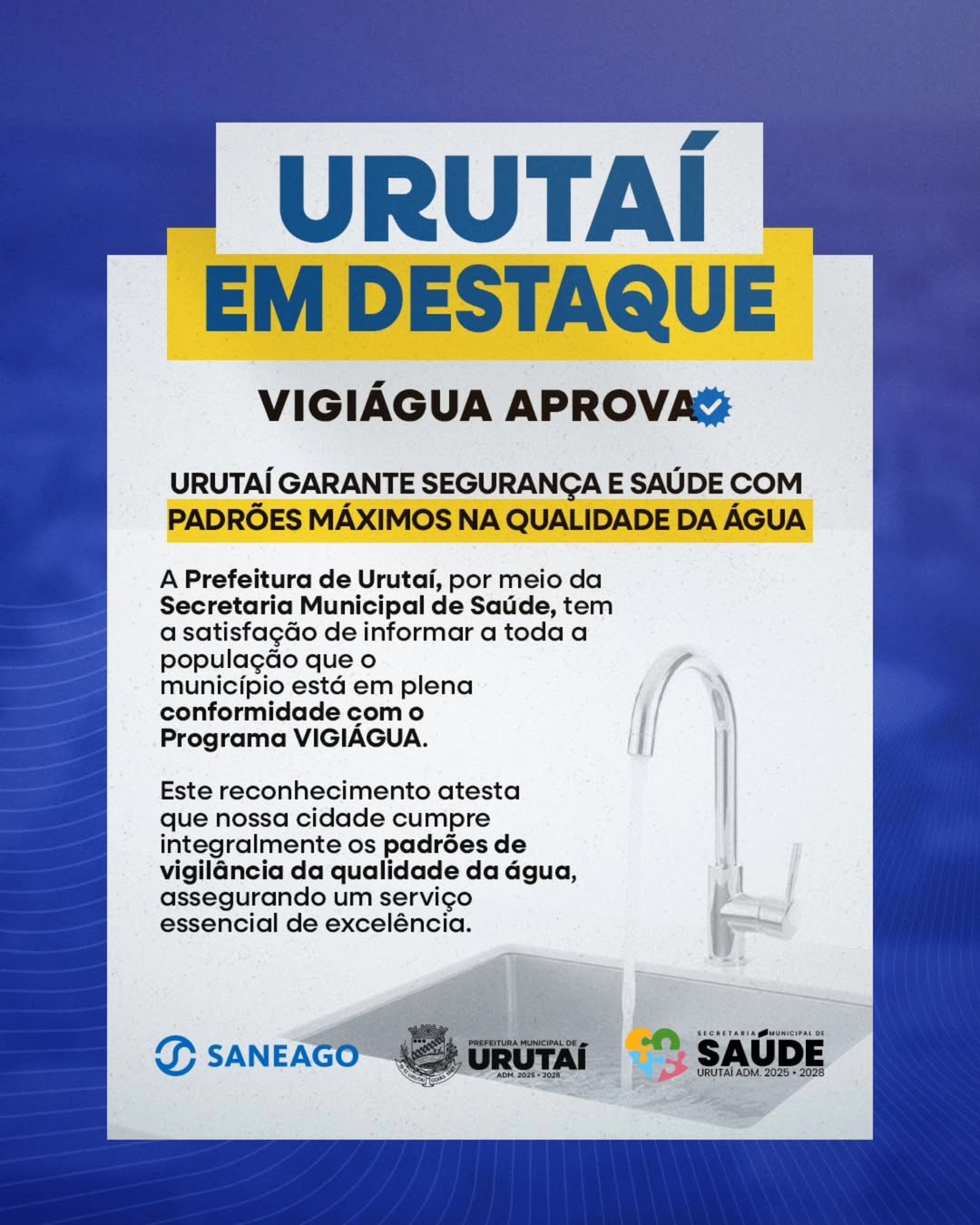 Temos uma ótima notícia para nossa população: Urutaí está em plena conformidade com o Sistema Nacional de Vigilância da Qualidade da Água para Consumo Humano – Vigiágua.